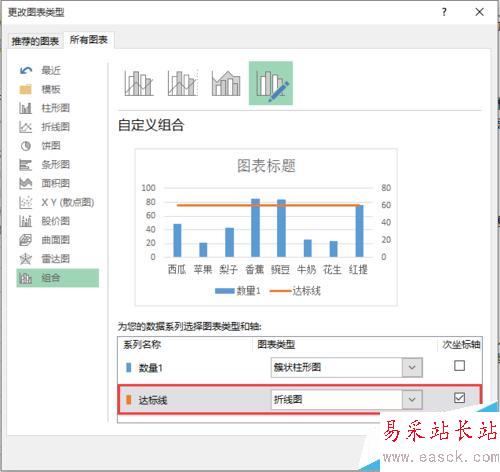 3、將橙色柱狀,設置為“次坐標”,并設置為折線圖,演示版本為Excel2013(其他版本操作類似)。在其他版本中,需要現將橙色柱狀設置為次坐標,然后再更改圖表類型為折線圖即可。