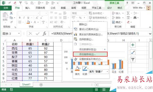 4、圖中“數量1”的柱狀為藍色,“數量2”的柱狀為橙色,首先在藍色的柱狀上,點擊鼠標右鍵,并在彈出的菜單中,選擇“添加趨勢線”。