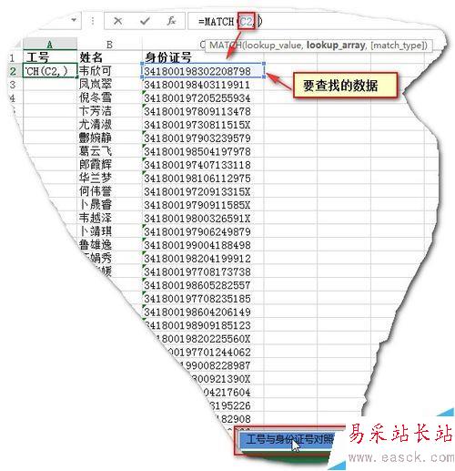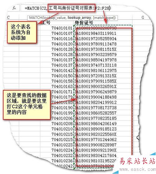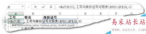 5、然后輸入“,0”,這樣完整的公式就是=MATCH(C2,工號與身份證號對照表!$F$2:F$28,0),最后就地回車,系統會自動返回到第一個表中