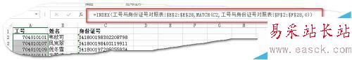 8、下一步我們就要找它所對應的工號給抓取過來,輸入公式:=index(點擊第二張表(工號所在表)選擇相應工號所在區域,MATCH(C2,工號與身份證號對照表!$F$2:$F$28,0))