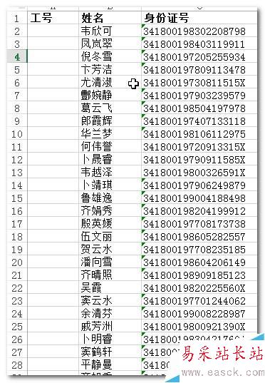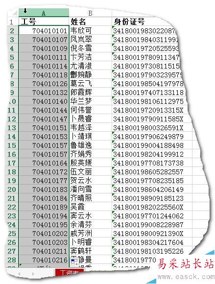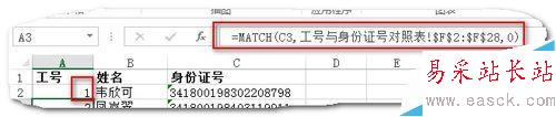 2、我們在“工號與身份證號對照表”中插入一列“工號”,如圖