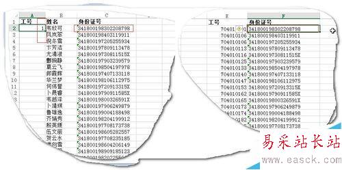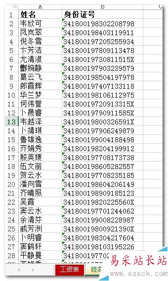1、我們從網上隨機找些身份證號,人員姓名(注,此處人員姓名與身份證號沒有直接的對應關系,數據只做演示使用,請勿用作其他用途)。一共兩張表,一張‘姓名與身份證號對照表”,一張“工號與身份證號對照表”,我們要做的是在第二張表中插入員工姓名