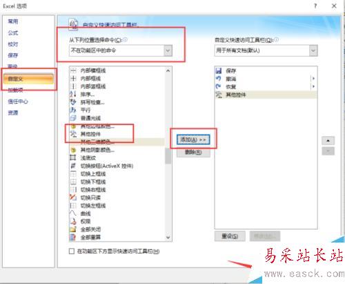 2、在彈出的”Excel窗口界面中,依次選擇左側(cè)窗口的”自定義選項,接著再點擊中間窗口的”從下列位置選擇命令(C)的下拉按鈕,選擇”不在功能區(qū)的命令,找到窗口中的”其他控件選中它,然后點擊【添加】,最后點擊【確定】按鈕。如圖所示;