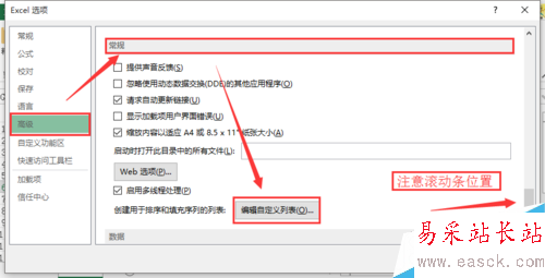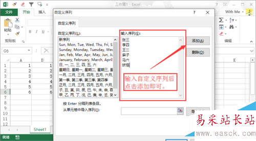 使用步驟1,進(jìn)入選項(xiàng),點(diǎn)擊“高級(jí)”后在其右側(cè)找到“編輯自定義列表”,在彈出新窗口“自定義序列”中,輸入自定義內(nèi)容,完成后點(diǎn)擊添加。