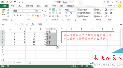 第八步:在E1單元格輸入任意自定義內(nèi)容后,依舊點(diǎn)擊選中單元格右下角進(jìn)行填充,可以看到自定義內(nèi)容能夠被有序的輸出了。