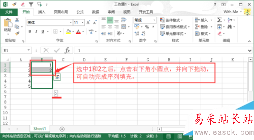 第三步:返回Excel主界面后,在單元格A1輸入內(nèi)容“1”之后,選中A1單元格,點(diǎn)擊起右下角的小黑點(diǎn)并向下拖動(dòng),松開鼠標(biāo)后,會(huì)出現(xiàn)按鈕,點(diǎn)擊向下小三角,并選擇“填充序列”即可完成填充