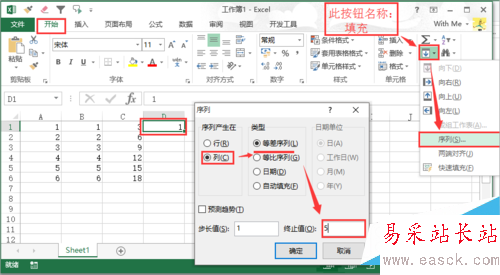 在D1單元格輸入數(shù)字“1”之后,點(diǎn)擊菜單欄“開始”欄目下的“填充”,在彈出的下拉選擇“序列”。彈出“序列”窗口后,點(diǎn)擊“列”,類型選“等差序列”,在步長(zhǎng)值設(shè)置為“1”(可自由設(shè)置),終止值設(shè)置為“5”并點(diǎn)擊確定。