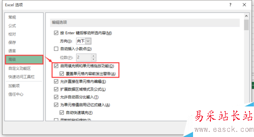 第二步:新彈出頁面后,點(diǎn)擊“高級(jí)”,并在右側(cè)找到“編輯選項(xiàng)”欄目下,勾選“啟用填充柄和單元格拖放功能"和“覆蓋單元格內(nèi)容前發(fā)出警告”。