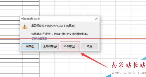 5、點擊之后會彈出兩個窗口,第一個窗口是提示你是否保存PERSONAL.XLS文件的。點擊“不保存”就好了,這樣不會對你的文件做出任何修改的。