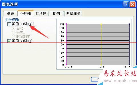 7、打開圖表選項,在坐標軸選項卡中,取消數值X軸