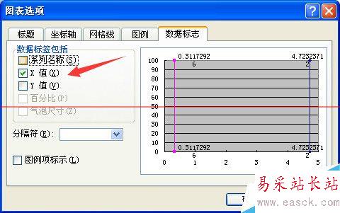 4、在圖表中點右鍵,進入圖標選項-選中數據標志中的X值,如圖所示