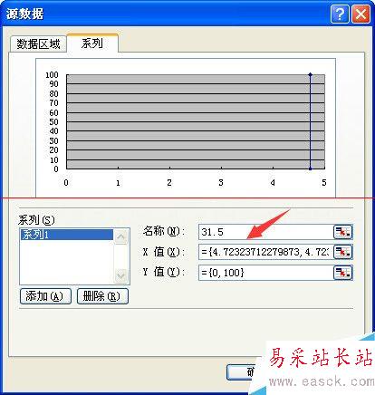 3、添加系列,在X欄輸入相應篩孔對應的POWER的值,Y輸入{0,100},如圖