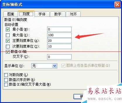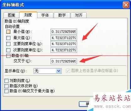 6、設置X坐標軸格式,選擇刻度選項卡,最小值及最大值中輸入最小及最大篩篩孔尺寸相應的POWER值,主要及次要刻度及交叉點分別輸最大篩孔及最小篩孔對應POWER值,如圖: