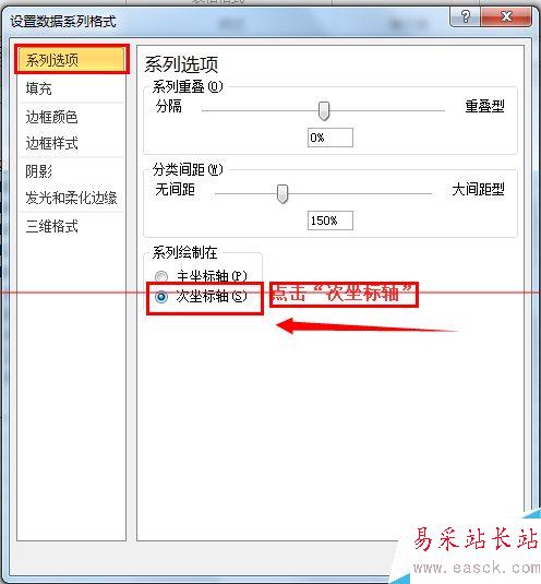 5、在“系列選項”→點擊“次坐標軸”→關閉