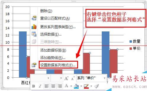 4、生成圖表后,“左鍵單擊紅色柱子”→再“點擊右鍵”→“設置數據系列格式”