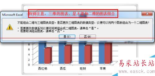 特別注意:三維(3D)的圖表,是不能用二維(2D)的圖表混合的,就是說三維的柱狀圖和二維的折線圖是不能放在同一張圖表上的。