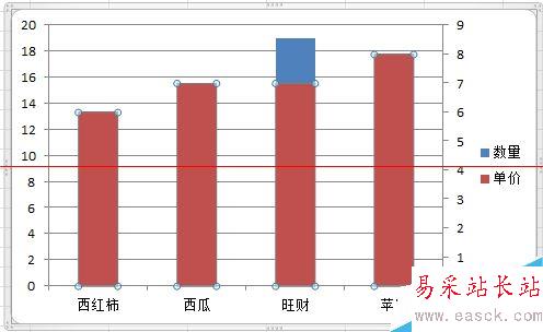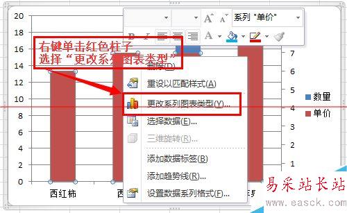 7、再次“右鍵單擊紅色柱子”→“更改系列圖表類型”