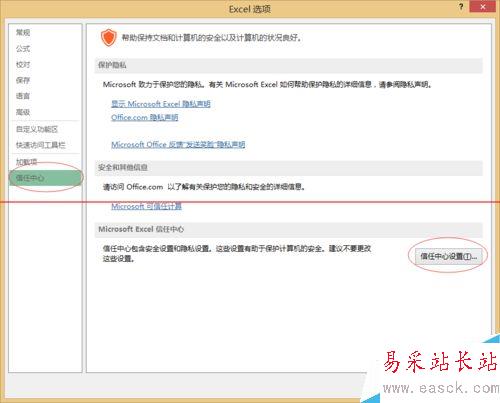 2、點擊左側最后一個“信任中心”,然后點擊右側的“信任中心設置”。