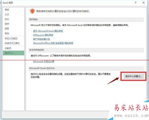 5、在信任中心選擇信任中心設(shè)置按鈕,如下圖所示
