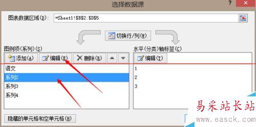 7、編輯系列的名稱。并以步驟4、5的方法選擇水平軸的標簽。點擊確認