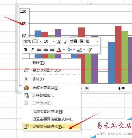 8、這時要改變縱坐標的最大值為100。選擇縱坐標值右鍵單擊,選擇設置坐標軸格式