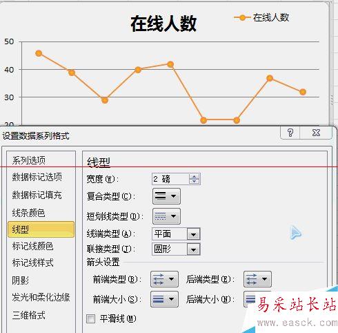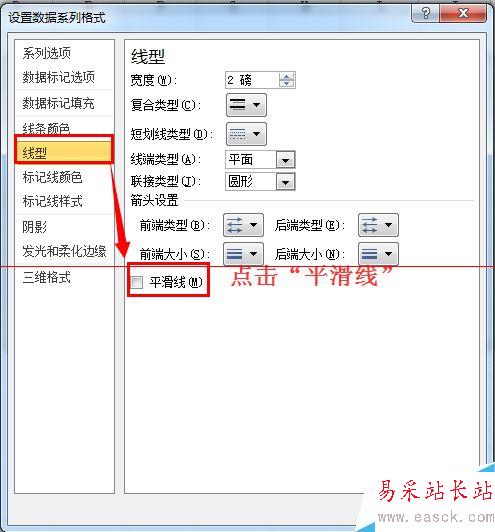 5、在彈出來的“設置數據系列格式”屬性框中,點選“線形”→勾選“平滑線”即可:
