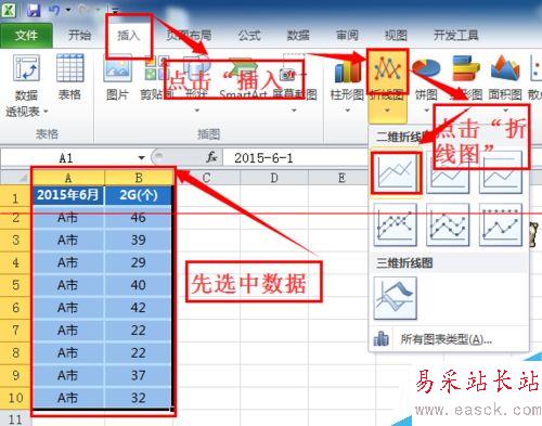 2、選中模擬數據,點擊菜單欄“插入”→“折線圖”→“二維折線圖”