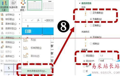 1)選中系列1,添加“誤差線”——選擇“其他誤差線”,設(shè)置垂直誤差線為“負(fù)偏差”,末端樣式無,誤差量百分比為100%;