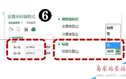 1)選擇X軸,雙擊進(jìn)入“設(shè)置坐標(biāo)軸格式”;將坐標(biāo)軸最小值定位41796(即第一事件的時間),最大值為42191;將“標(biāo)簽位置”設(shè)為“無”。