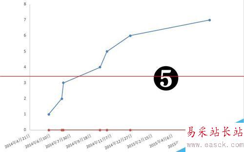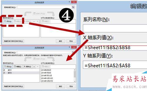 2)在彈出的對話框中,單擊“添加”,X軸系列值選擇“日期”列數(shù)據(jù),Y軸系列值選擇“序號”列數(shù)據(jù);再次單擊“添加”,X軸系列值選擇“日期”列數(shù)據(jù),Y軸系列值選擇“輔助”列數(shù)據(jù)(如下圖二所示)。