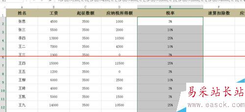 4、在稅率列輸入=IF(D2<=1500,0.03,IF(D2<=4500,1,IF(D2<=9000,0.2,IF(D2<=35000,0.25,IF(D2<=55000,0.3,IF(D2<=80000,0.35,0.45))))) ),判斷應納稅所得額的在哪一個層次。對稅率列的數字設置成百分比顯示,下拉填充。