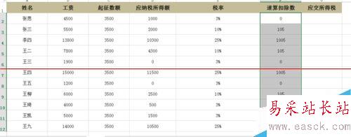 6、在應交所得稅列輸入公式 =D2*E2-F2 ,即表示計算應交所得稅(應納所得稅額×稅率-速算扣除數)。下拉填充即可得到所有的應交所得稅了。