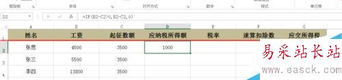 3、在應納稅所得額列輸入=IF(B2-C2>0,B2-C2,0),表示如果工資大于起征點(即工資-起征點>0),則計算應納稅所得額,否則為0 。下拉填充應納稅所得額欄。