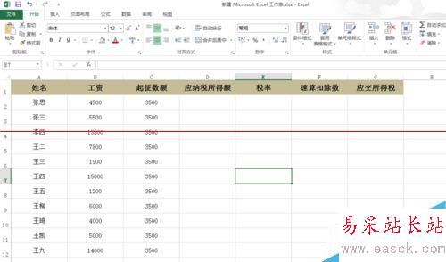 2、打開工資表,并填充相關內容,起征點、應納稅所得額、稅率、速算扣除數、應交所得稅等。