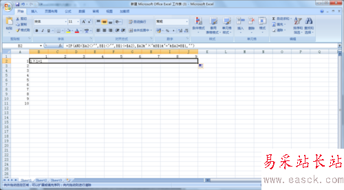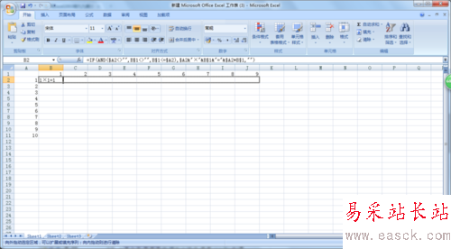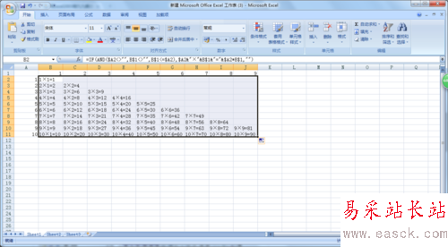 4、現(xiàn)在就在B2單元格中輸入“ =IF(AND($A2<>"",B$1<>"",B$1<=$A2),$A2&"×"&B$1&"="&$A2*B$1,"") ”