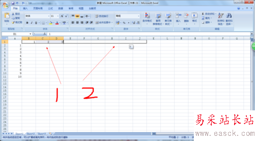 2、在這教大家一個小技巧可以方便快速輸入序號(1.2.3.....10),行,列方法都可以用,就是在前面3個序號先手動填寫進去,如B1 1 , C1 2 , D1 3,然后選中這三個單元格,出現(xiàn)了一個實心的“+”,你就可能橫向拉動到J1,結果你就可 看看,