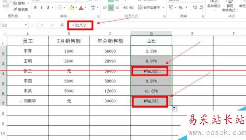 2、這里先輸入普通的公式   =B2/C2   ,看到出現(xiàn)錯(cuò)誤信號(hào)。