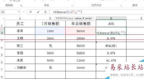 4、輸入完整的公式  =IFERROR(B2/C2,"")   ,如果錯(cuò)誤就返回空白,否則返回占比值,按下enter鍵。