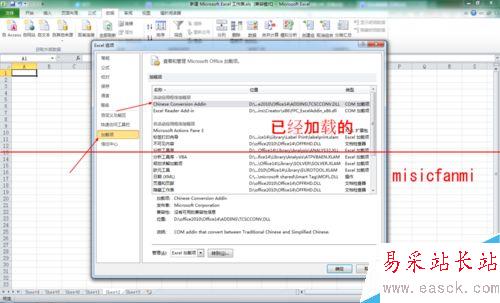 第三步:在彈出的窗口中,找到加載項,在右側的內框中可以看到已經加載的工具。