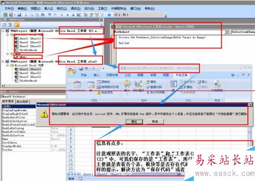 在保存EXCEL的時候,彈出對話框“隱私問題警告:此文檔中包含宏、ActiveX控件、XML擴展包信息或Web組件,其中可能包含個人信息,并且這些信息不能通過"文檔檢查器"進行刪除”。這個提示并不影響我們操作,只是在我們保存的時候,總是提示,給人的感覺就不順暢。解決這個問題很簡單,因為提示中已經給出了我們需要檢查的地方,只是解決過程大家不熟悉。