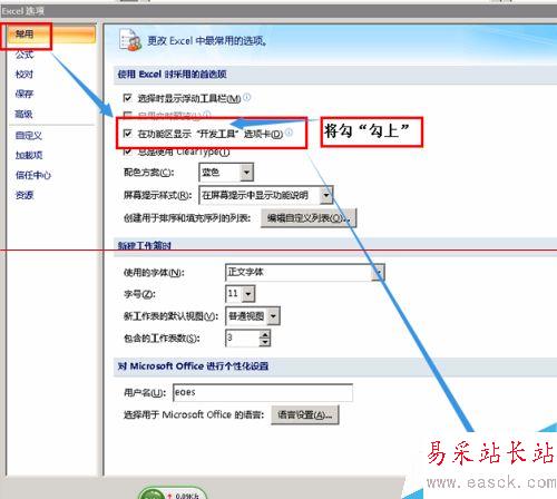 1、EXCEL2007打開方式:點“左上角” → “Excel選項” → “常規” → 勾上“在功能顯示開發工具選項卡” → “確定”