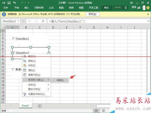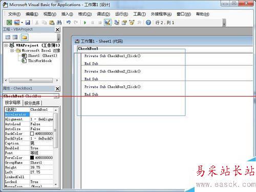 7、根據上面的解釋我們給出checkbox2和checkbox3的語句填寫,具體如圖填寫。填寫完成后點擊保存。(框內的文字不用寫)建議將已經做好的excel表格保存成.xlsm格式的,也就是宏模式的文檔。