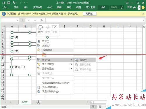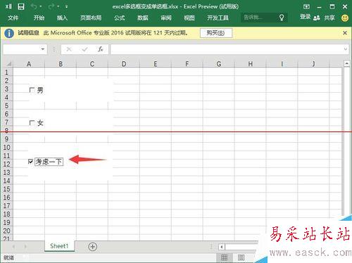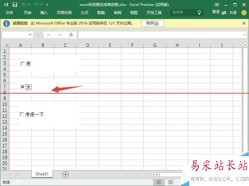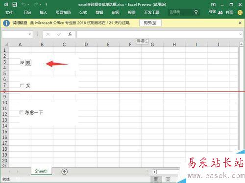 8、圖中是這次制作的效果樣式,先選中"男",在選擇“女”,“男”選項自動清除了,這樣就完成了將excel多選框變成單選框的。