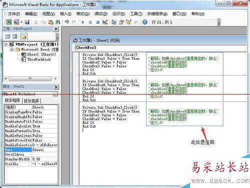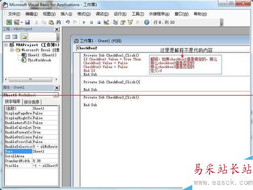 6、在這里我們就要用到 if語句幫我們完成單選,首先完成多選框checkbox1的語句填寫,具體解釋在圖片中顯示。(框內的文字不用寫)