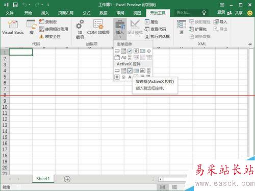 2、點擊開發工具選項卡,在選項卡下面點擊插入選項,在插入選項里面插入active X 控件里面的多選框控件。