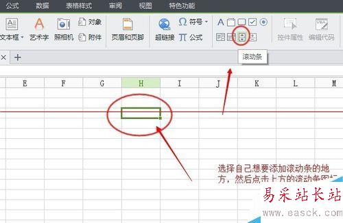 3、然后選中自己想要加滾動條的單元格,再在上方找到滾動條圖標(biāo),點擊滾動條圖標(biāo)。