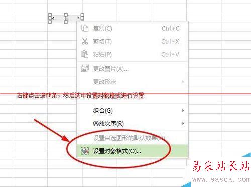 5、滾動條添加好了,下一步就是進行設(shè)置。右鍵點擊滾動條,然后再彈出的對話框選擇設(shè)置對象格式進行設(shè)置。