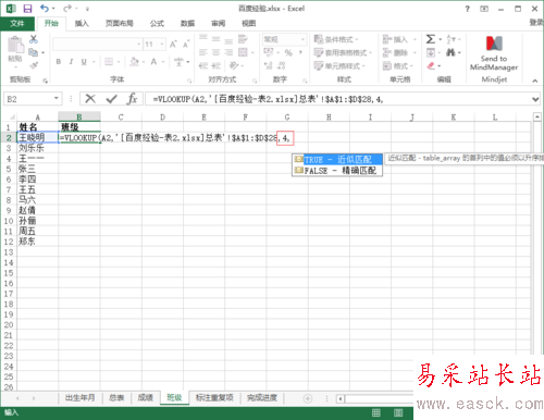 7、因為我們要返回的是【百度經驗-表2】中第四列的班級信息,所以在公式中再輸入“4,”(逗號是英文的)。(ps:提示信息讓我們選擇“TRUE”或“FALSE”,不用選,直接按回車鍵就可以)