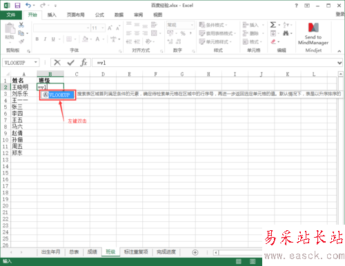 3、在單元格中輸入“=vl”會自動提示出VLOOKUP函數,雙擊藍色的函數部分。