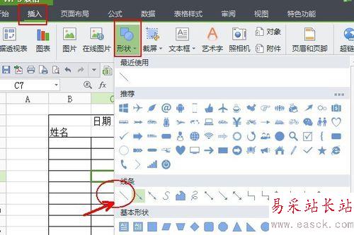 4、在頂端菜單里面點(diǎn)擊“插入”選擇斜線,線條的第一個(gè)